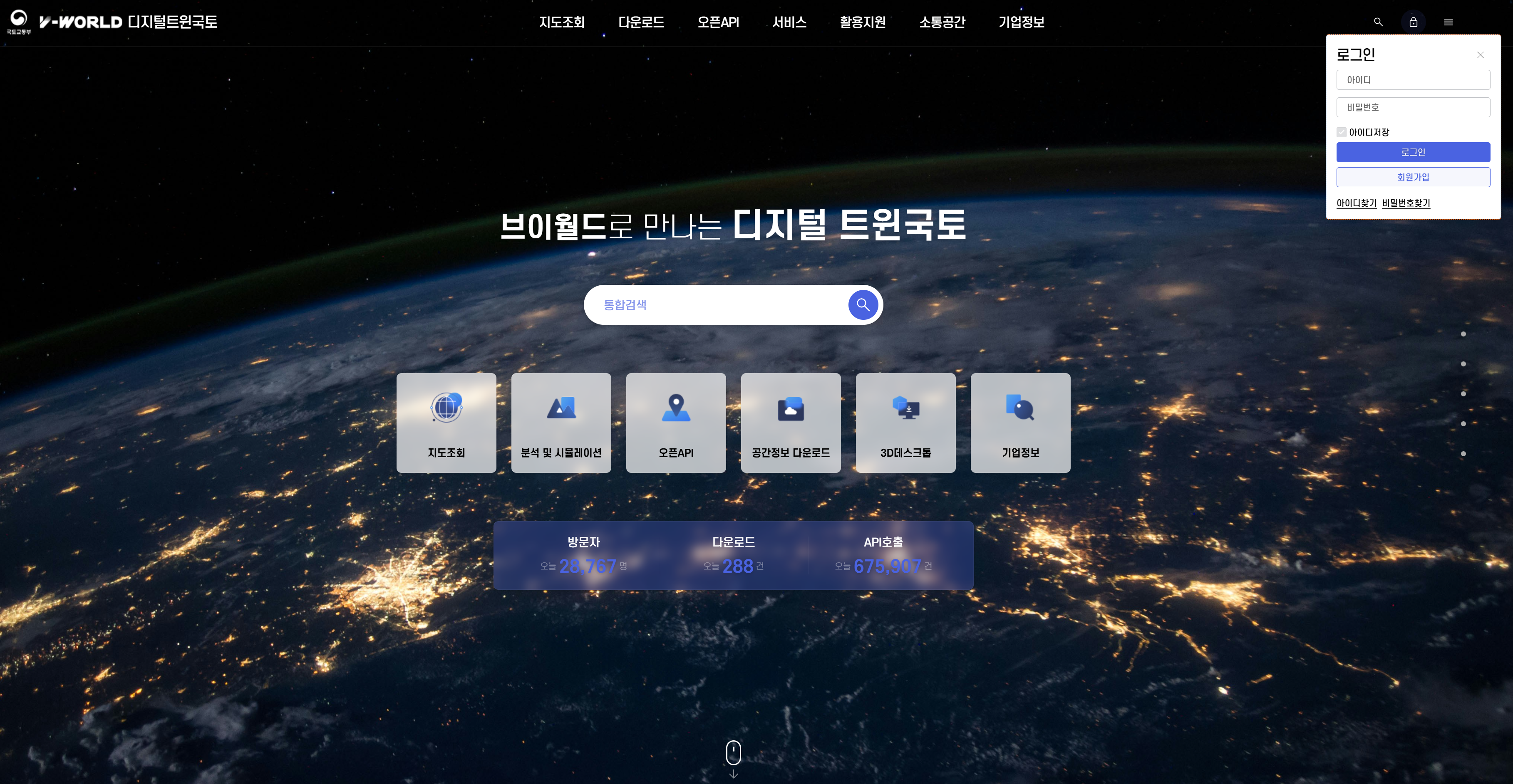 브이월드 홈페이지에 접속하시면 아래와 같은 화면이 나오는데, 우선 브이월드의 모든 데이터에 접근 및 다운로드하려면 회원가입 및 로그인이 필요합니다. 이 절차는 매우 간단하니, 빠르게 해주시면 됩니다!